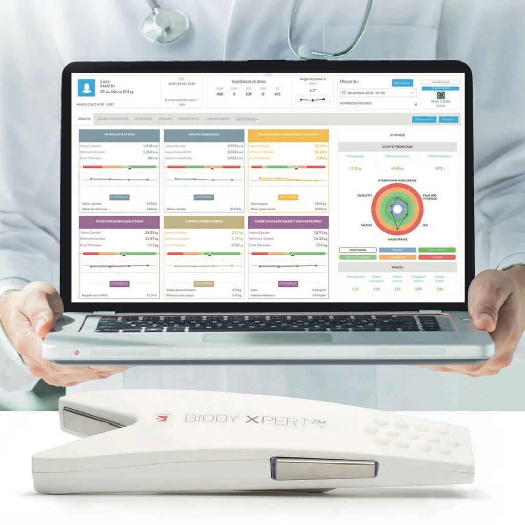Le Biody-Xpert utilise la bio-impédancemétrie segmentaire pour mesurer avec précision la composition de votre corps : masse grasse, masse musculaire, eau intracellulaire et extracellulaire, métabolisme de base, et répartition par zone (bras, tronc, jambes). L’analyse se fait en quelques minutes, sans douleur, et les résultats sont présentés sous forme de graphiques clairs et lisibles.